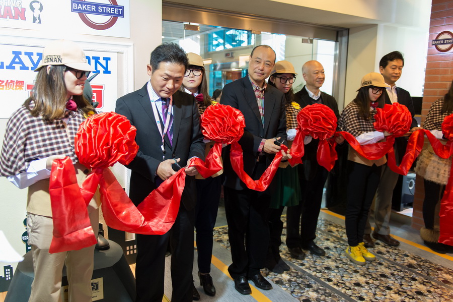 随着其他几位领导的致辞和剪彩仪式的结束,等待已久的粉丝们瞬间挤满了店堂。有拿着答题卡四处寻找答案的,有排队参加甜点蛋糕畅吃的,有挑选柯南正版书籍和周边的,有兴高采烈地试穿少年侦探团服装道具的。吸引最多粉丝目光和镜头的是店里那尊柯南的塑像,以及有轨电车和电话亭的布置,大家纷纷上前合影留念。不一会儿收银处已经排了长长的队伍,一身少年侦探团打扮的工作人员热情地为大家服务着,还有几位热情的粉丝身着COS服出现在了现场,其中更有一位全身黑色,只露出双眼和嘴的角色——是的,这正是《名侦探柯南》系列中最经典的犯人形象,“黑衣人”的出现赢得了无数的欢呼,也谋杀了现场媒体与粉丝们无数的快门,整个店堂都沉浸在浓浓的欢乐气氛中。