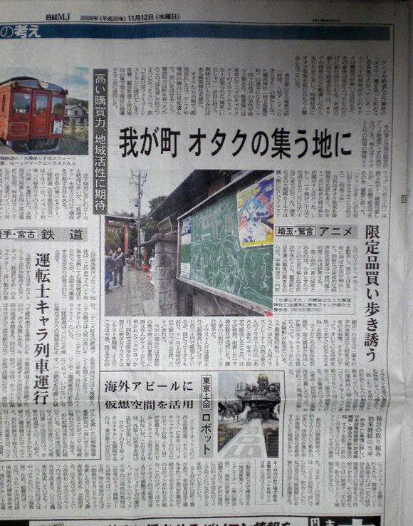 于12日的日经流通新闻(日经MJ)上,登刊了一条特别的新闻,介绍了御宅族们所聚集的几个靠动漫发家的城市小镇,并将其一一列举了出来,讲述了它们成功的过程的内容等,其中特别提到了靠着幸运星效应的鹫宫町,其经济运作效果产生的价值已经达到了1亿元的信息…以下为详细报道