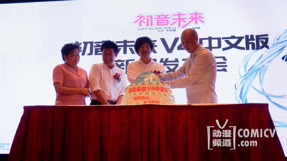 最后,现场嘉宾上台举行恭贺仪式,共同切下了预祝初音未来V4中文版的软件成功发售的蛋糕!