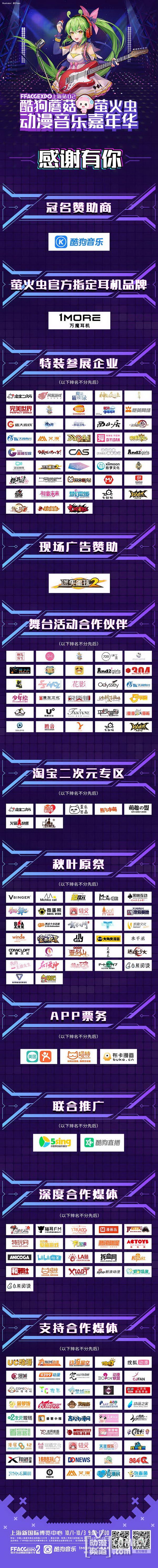 天闻角川,海岸线工作室-《纳米核心》,艾漫,Hobbymax,七创社-《凹凸世界》,Vsinger ,网易游戏-《魔法禁书目录(正版手游)》、阴阳师、神都夜行录、非人学园,盛大游戏-《神无月》、《神域召唤》,腾讯游戏-《初音未来:梦幻歌姬》,西山居-剑网3重制版、梦间集等诸多实力动漫游戏厂商加盟!
