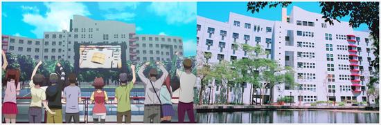 图中学校正门的这一个电梯,通向校园最核心的主干道,若不是有人物在,小编简直分不清这两张图哪张是实景,哪张是动画了。